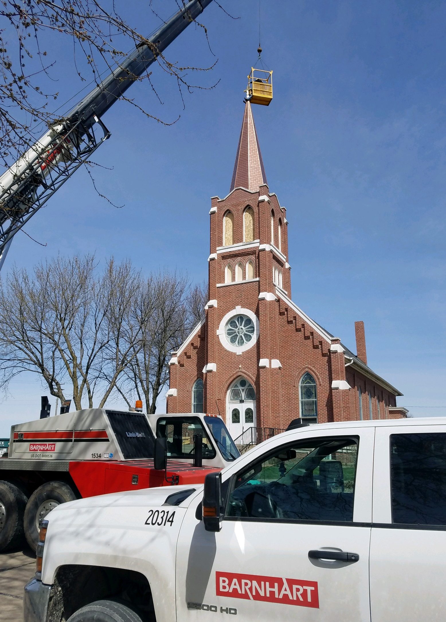 The church needed a company capable of lifting and setting the 30-foot tall steeple. It also weighed 23,000 pounds, even though the copper-clad steeple was hollow. Barnhart’s Lincoln office stepped in and donated its services.