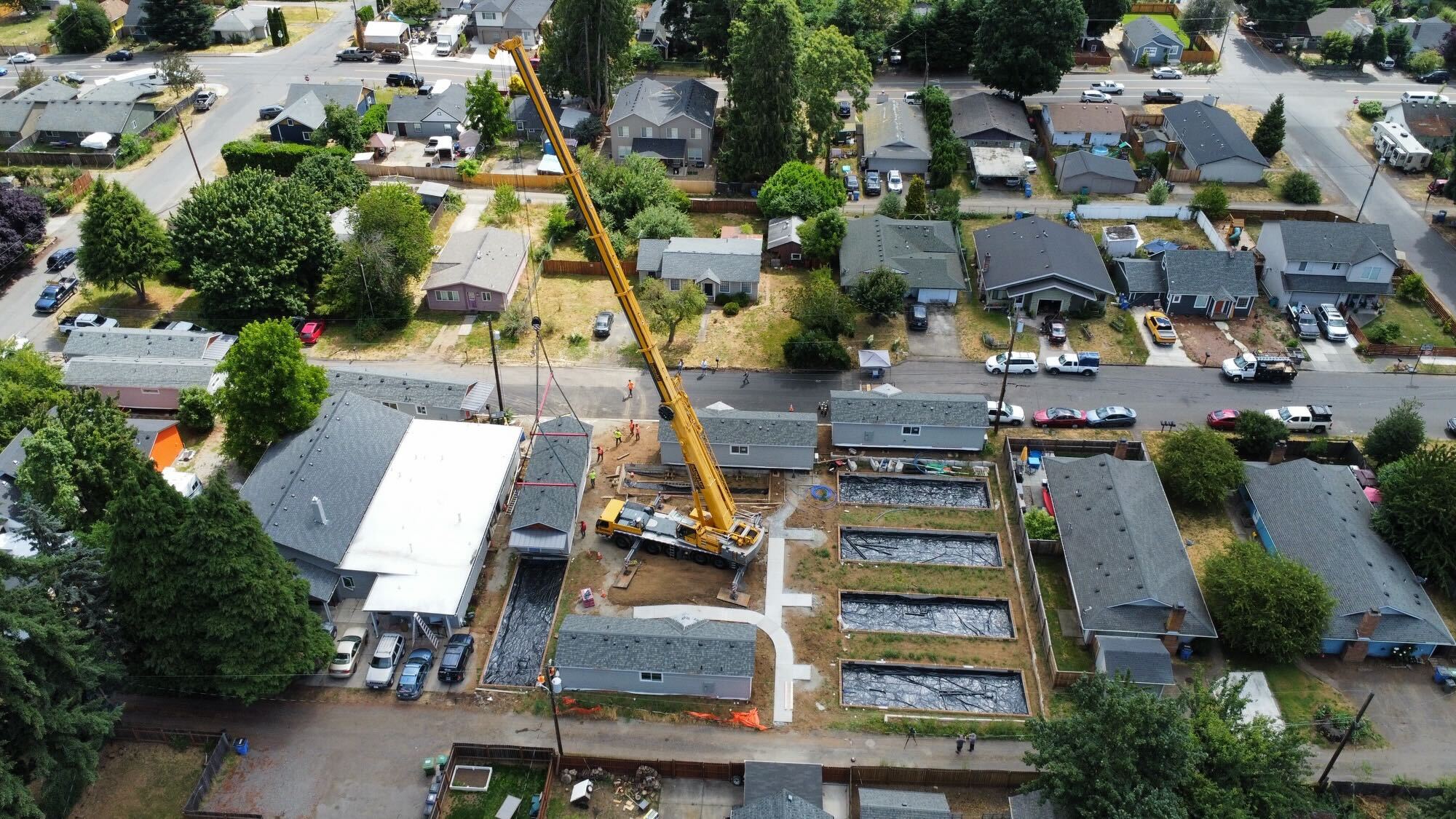 Each tiny home was 14’ wide x 44’ long, weighed 34,000 pounds and contained 735 square feet of living space. They were brought in by trailer to be set onto their designated pads. The footprint of the entire community was small and there were power lines to consider and avoid.
