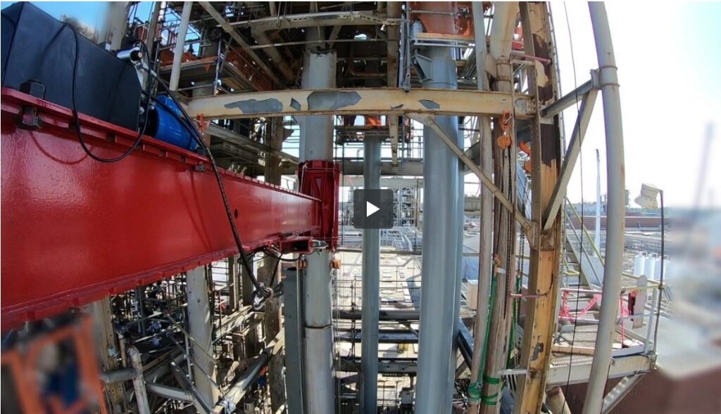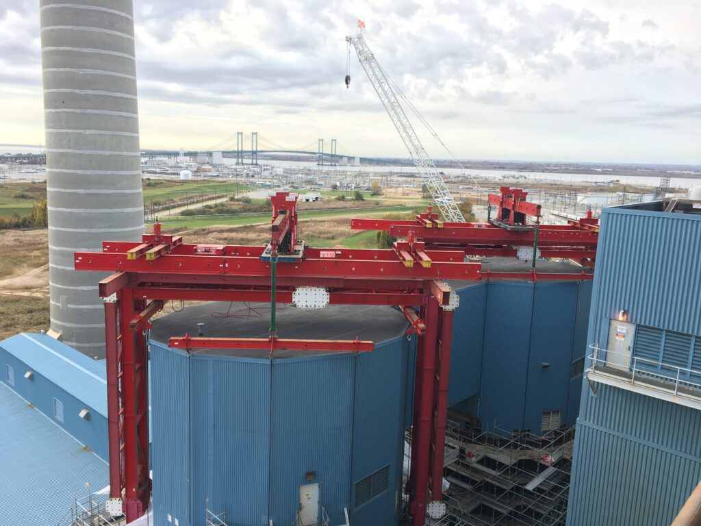 The solution was the erection two identical modular lift tower frames (MLTs) to extend up and over the scrubber. Pull-up gantries were installed on the bridge assembly of the towers to provide tension to the system. Custom length high-capacity wire ropes were designed and fabricated to support the height of the scrubber units. The system was able to support the full weight of the scrubbers and eliminate the possibility of a collapse.
