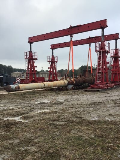 The soil conditions also meant that the crew could not drive the Goldhofer trailer directly under the barrel once it was suspended in the air. Barnhart utilized 45′ long multi-purpose girders (MPG) as header beams for the gantry arrangement. Slide shoes were used atop the girders to transfer the piece to more level ground. This arrangement allowed the trailer to have a direct shot under the piece as it was loaded.