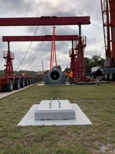 On site, the Barnhart crew reversed the method used at St. Julien’s Creek. The truck pulled underneath the 500-ton one-shot gantries and lifted the barrel off the trailer with 45′ MPGs. From there, Barnhart utilized its slide system to shift the barrel over to the concrete pad and lowered it down.