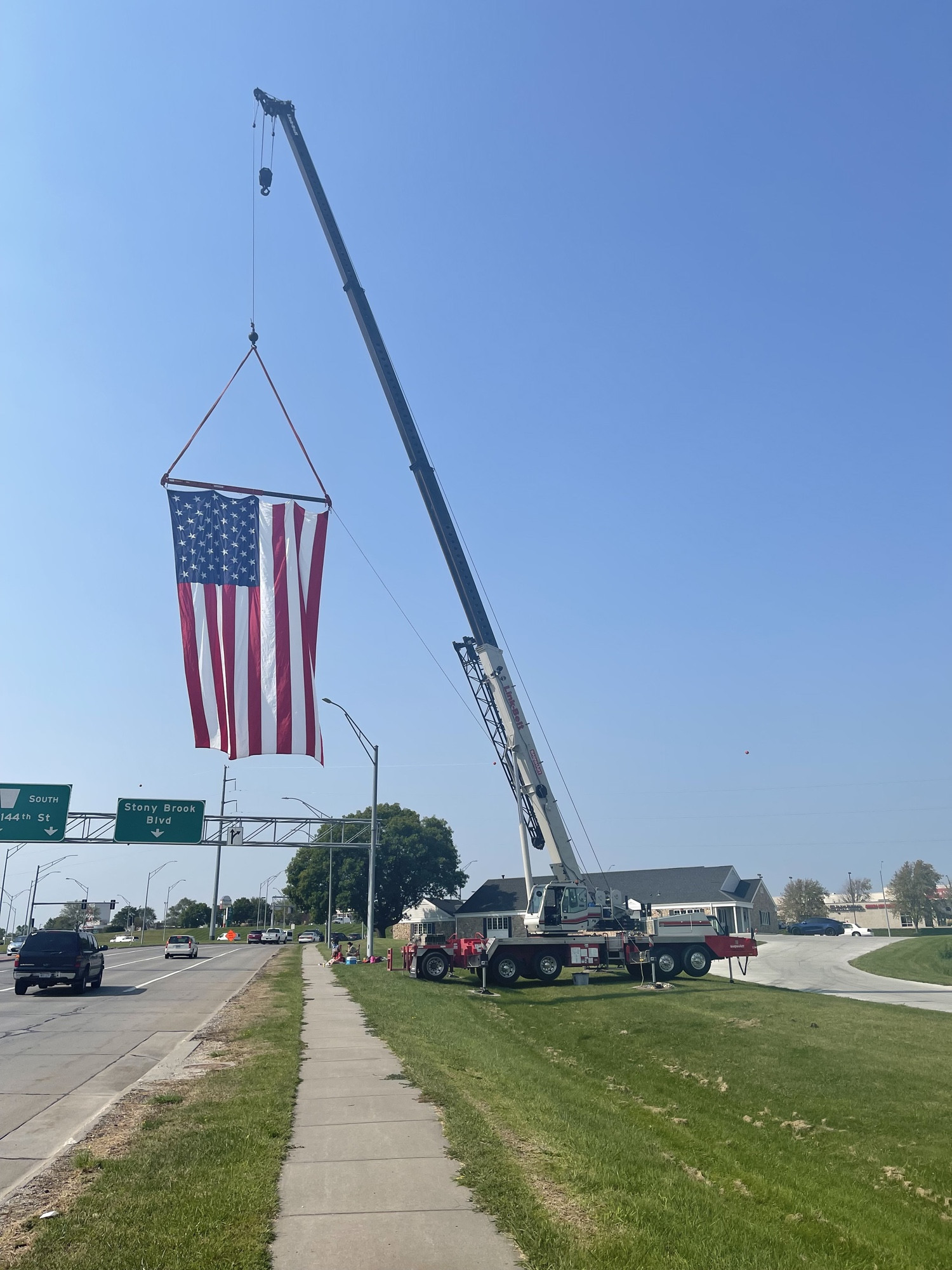 The crew set up a crane at Millard Veterinary Clinic in Omaha, along the route the hearse and funeral procession would follow from Epply Airfield to the Braman Mortuary in Millard. A 15 ft x 25 ft American flag was draped from an EP-182 Barnhart Spreader Bar. Using Omaha’s unit 1632 (LinkBelt 8660 Series 2), they suspended over the roadway the final flag that Cpl. Page travelled under along the route.