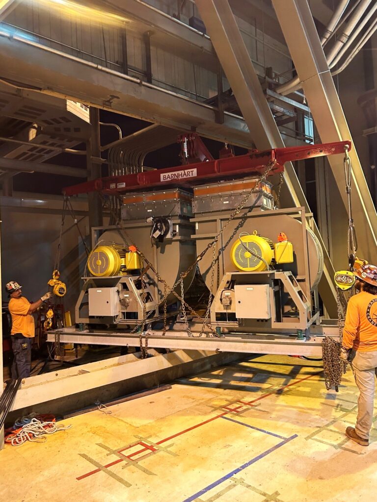 The fan, located in the turbine building, had to be extracted through a wall opening into the plant’s switchyard. To ensure safety, Barnhart conducted daily Job Hazard Analyses and enforced a 100-hour safety standdown to address risks such as pinch points and suspended loads. Standard operating procedures were followed rigorously.