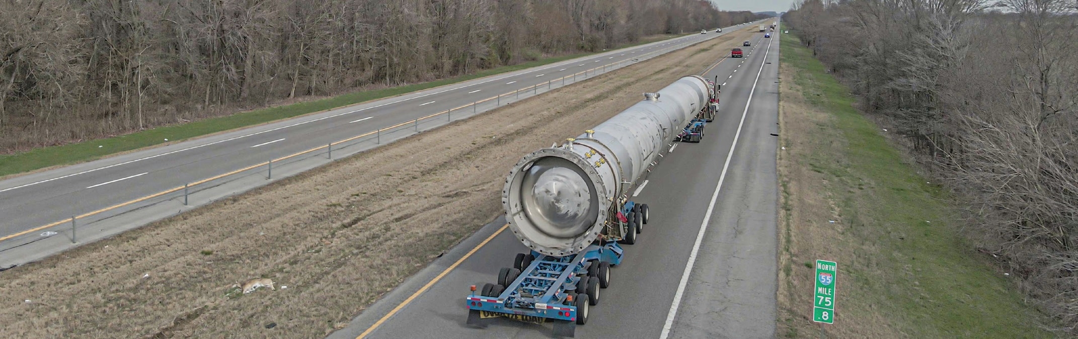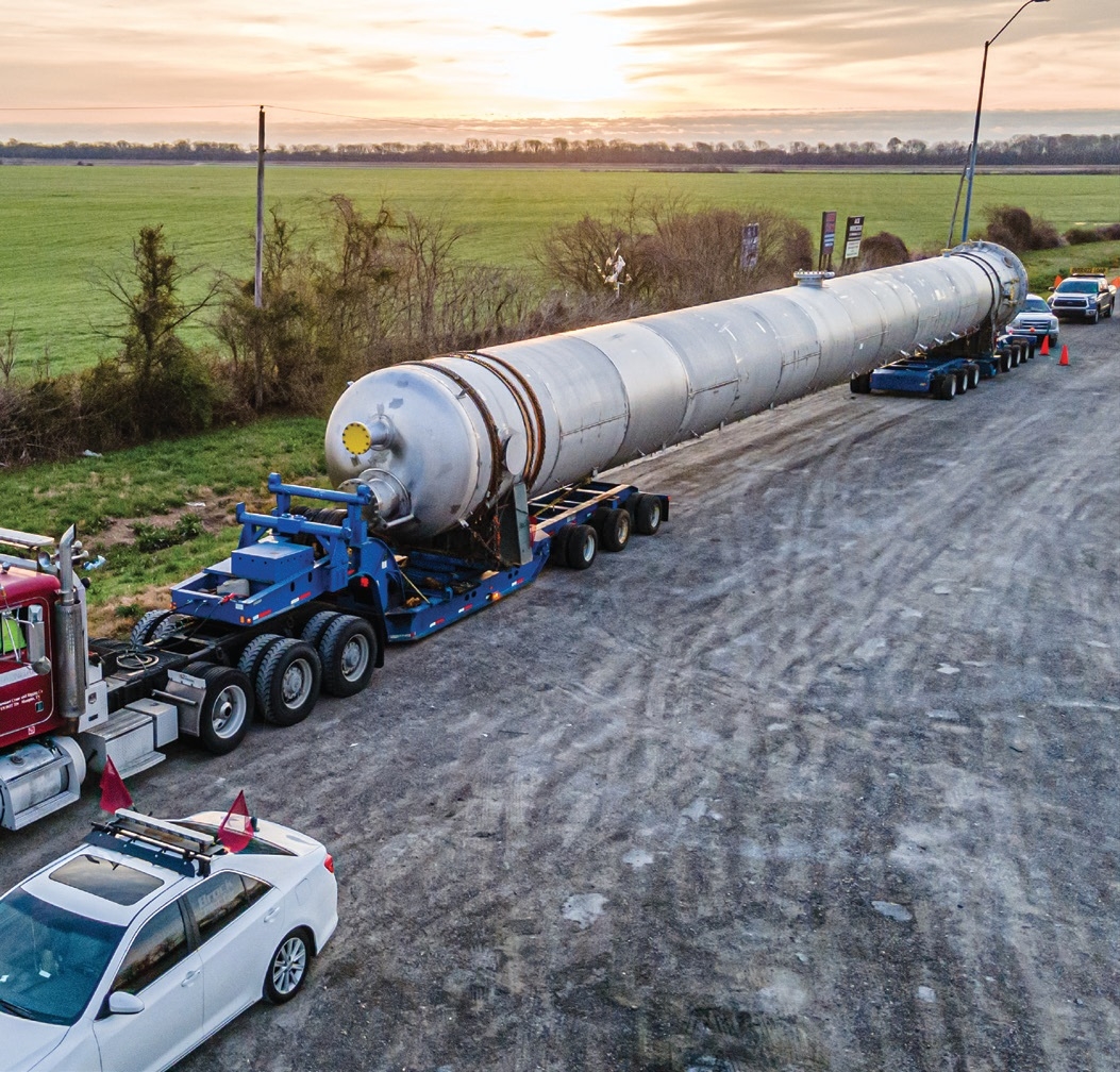 A 129-foot-long absorber vessel needed to be transported from a fabricator in Winterville, North Carolina, across the country to a chemical plant in Beatrice, Nebraska. The vessel weighed 138,271 pounds.