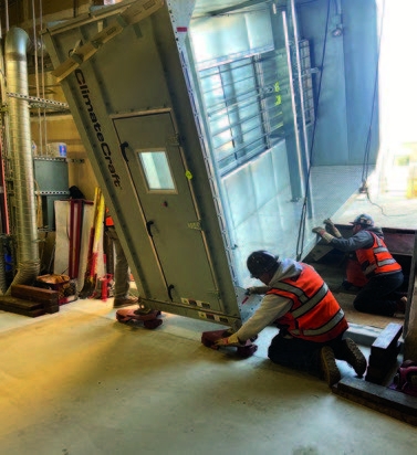 The Bear Paw was needed to navigate an elevated steel framework 3 feet from the opening. It allowed the front of the unit to be lowered while holding the rear off the structure until it was all the way in the mechanical room.