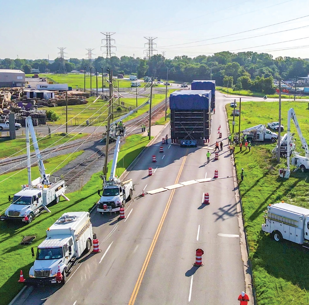 The 31’ tall convoy required moving numerous electrical and communication lines along the route. Most of the electrical lines had to be de-energized and dropped. Two sets of electrical transmission lines also had to be de-energized and grounded due to the load’s height. A railroad cantilever signal also had to be removed. Due to a well-coordinated effort, the haul was completed in a little over an hour.