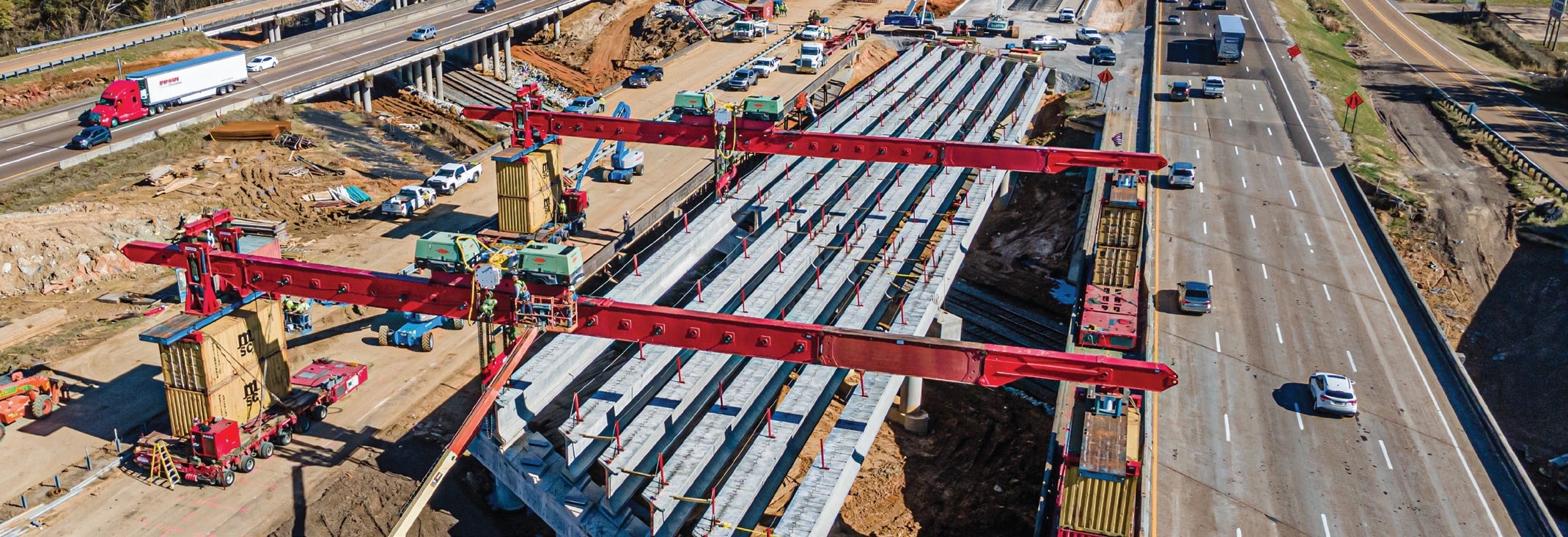 The two sets of PSTs were spaced 133 feet apart and separated by the new bridge. One set was on a Hwy 51 bridge during the lifts while the other PSTs were on an I-20 bridge. The SPMT system allowed Barnhart to relocate the lift system to the next girder while meeting the loading requirements. Despite delays with girder delivery, Barnhart completed the project ahead of schedule and under budget.