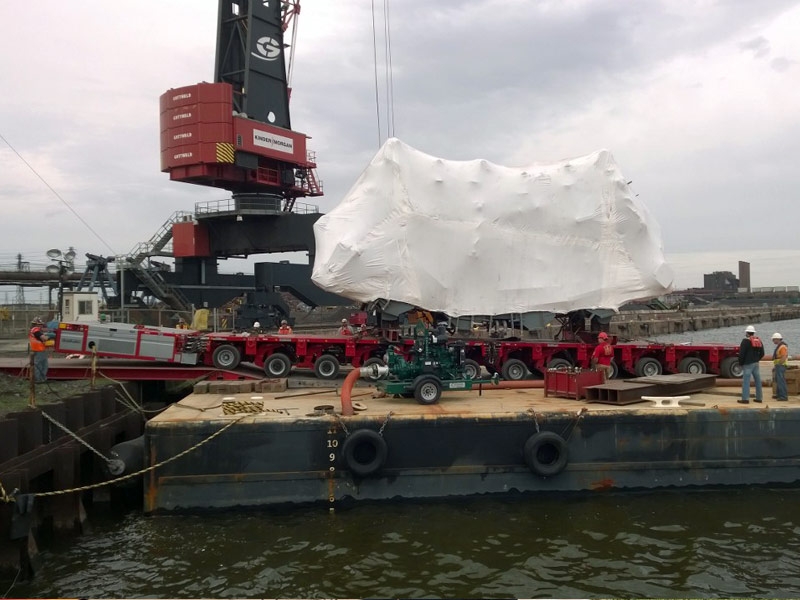 Since port cranes at Burns Harbor could not handle the weight, another transload was made by the Barnhart TC3000 at the Port of Chicago returning the cargo to a deck barge for roll-off. This solution required extensive coordination between the Mobile and Chicago branches as well as the management of multiple subcontractors.
