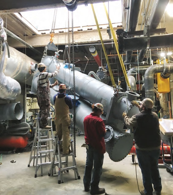 Barnhart used a 275-ton crane to lift the chiller to the top of the building where there was a roof hatch. But preplanning had determined that the chiller was larger than the opening on the roof.