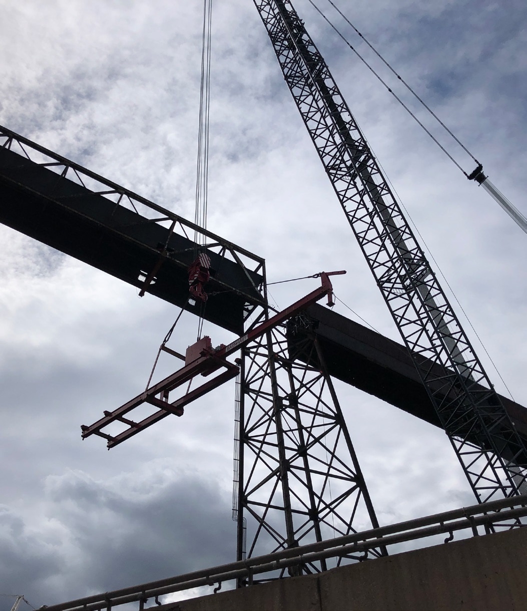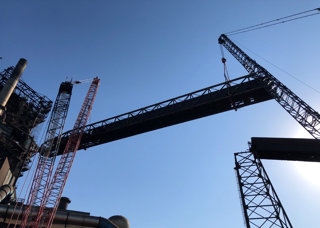 Using spreader bars, Barnhart made a tandem lift using both cranes at the same time. The conveyor section had to be swung 40 feet to the right to clear the tower.