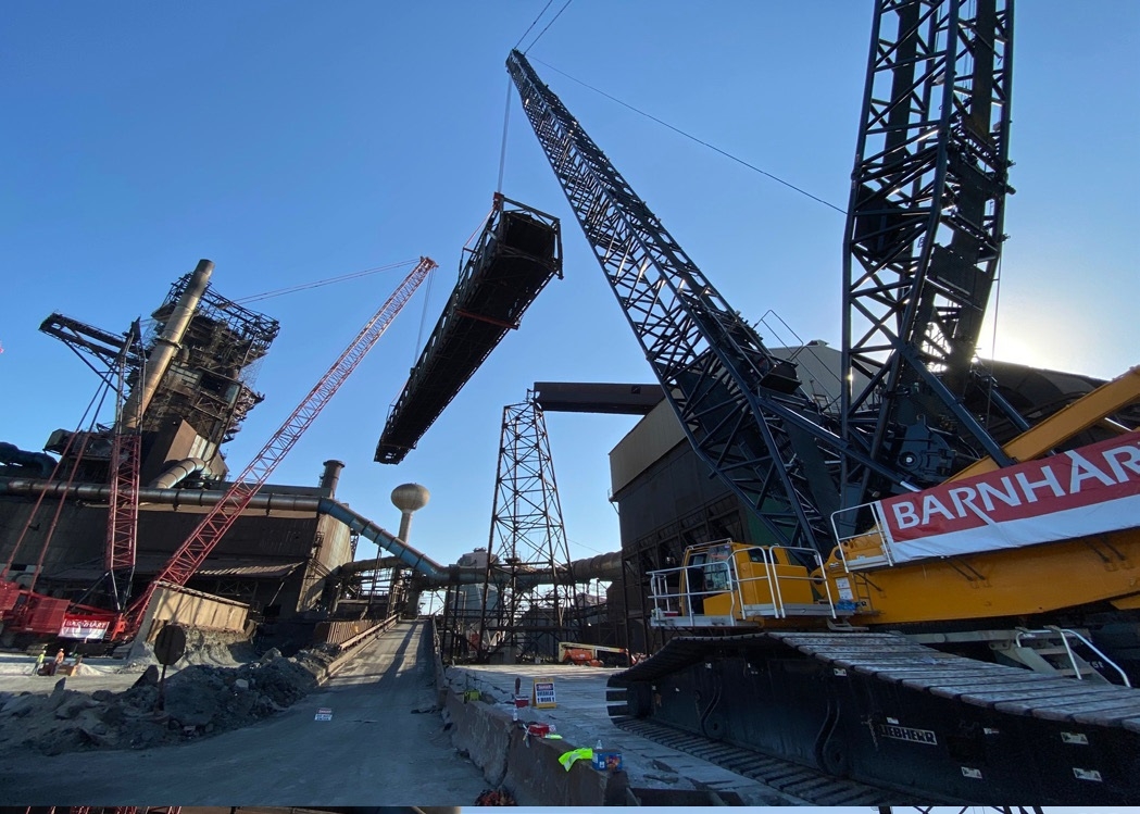 Barnhart was called to a steel mill in Illinois to remove and replace a 320’ conveyer section weighing approximately 600,000 pounds. The crew assembled an LR1600 crawler crane in full super lift with tray and a Manitowoc M18000 crawler crane with full super lift and maxer wagon.