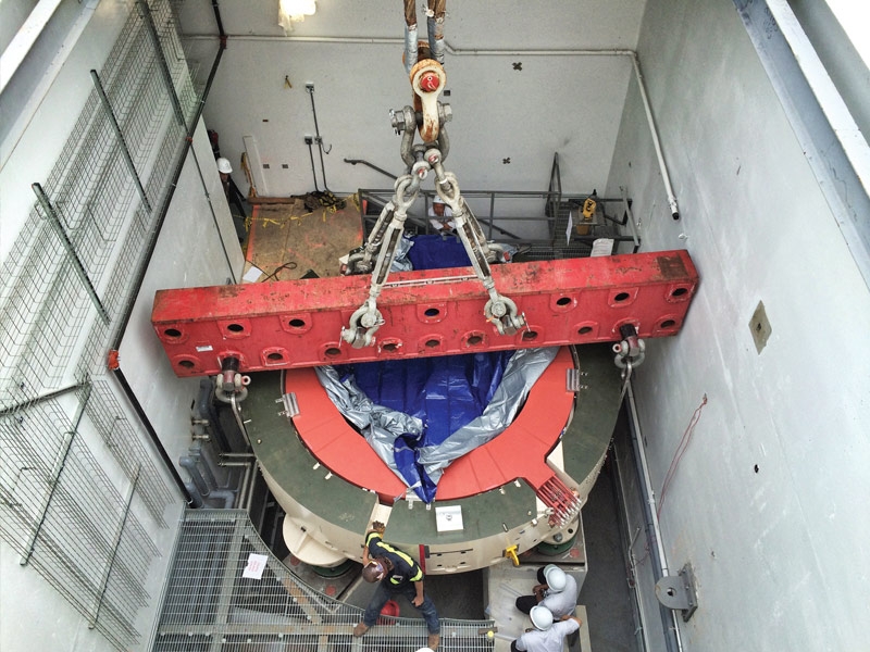 A modified Barnhart Stator Frame was able to lift and move horizontally over the opening, lower and then side shift to required location. Both halves had to be set within +/- 1 millimeter. Equipment included were Barnhart's 200T hoist and an elevated 600T gantry system.