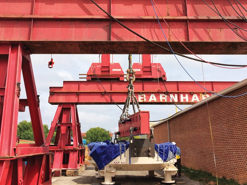 Barnhart was called upon to provide logistical and heavy rigging expertise to receive and assemble an $8 million piece of medical equipment, known as a cyclotron, in Knoxville, TN. Given the logistical complexity and space limitations on site, the cyclotron pieces were received at one of Barnhart's local facilities. There, Barnhart assembled the cyclotron into two large sections - 110 metric tons each - which made for faster final assembly at the site. Barnhart offloaded, staged, and then preassembled the sections using its 44a gantry with 200T swivel and a 500T slide system.