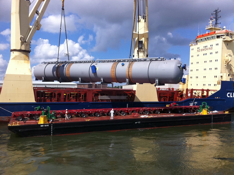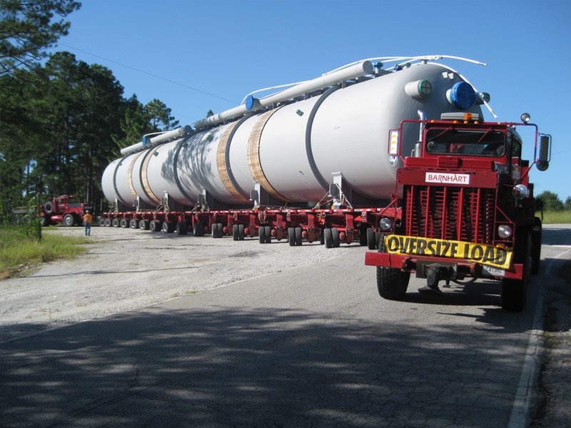 Barnhart was hired to move four 300-ton deaerators to two separate nuclear plants. They were fabricated in South Korea, so Barnhart had to receive all four from ship's gear and then transfer them to a barge, roll off and haul them to their destination.