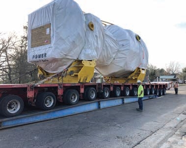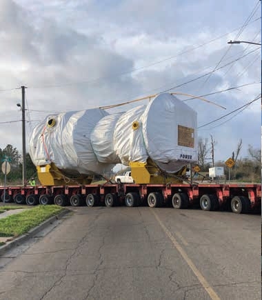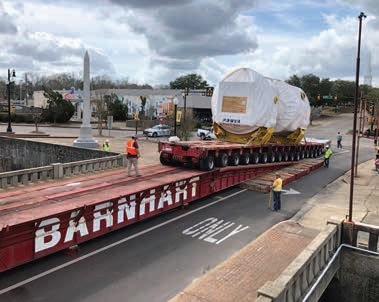 The turbine was loaded to a 16-line PST Goldhofer to be transported five miles across downtown Hattiesburg, Mississippi, to the next rail spur on the north side of the problem bridges. The City of Hattiesburg required that the transport be done on a Sunday morning when traffic was the lightest.