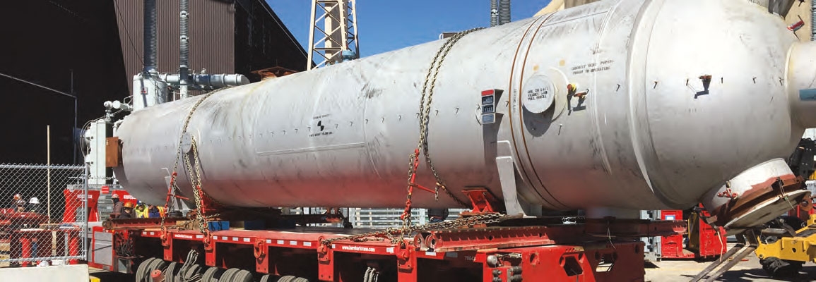 The feedwater heaters were loaded onto a Goldhofer PSTE for both removal and installation. A major challenge was the limited wall opening size that made for tight clearances. Barnhart and the customer worked together on a plan and executed the scope of the project well.