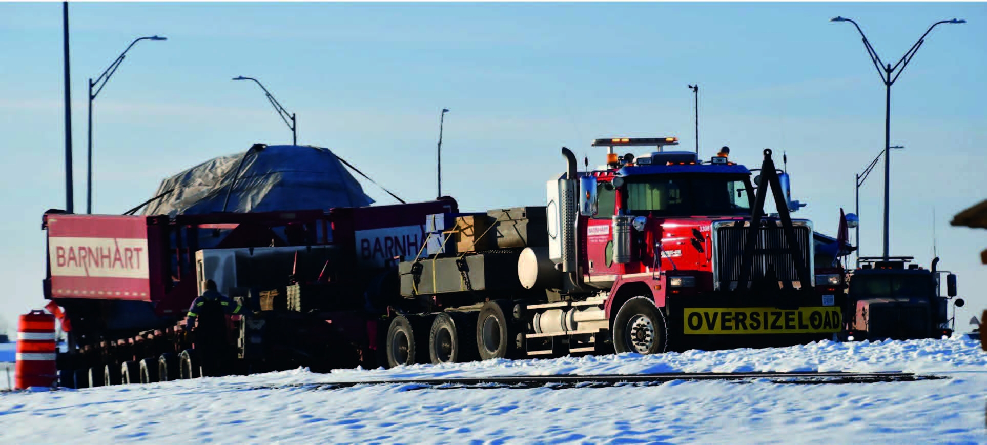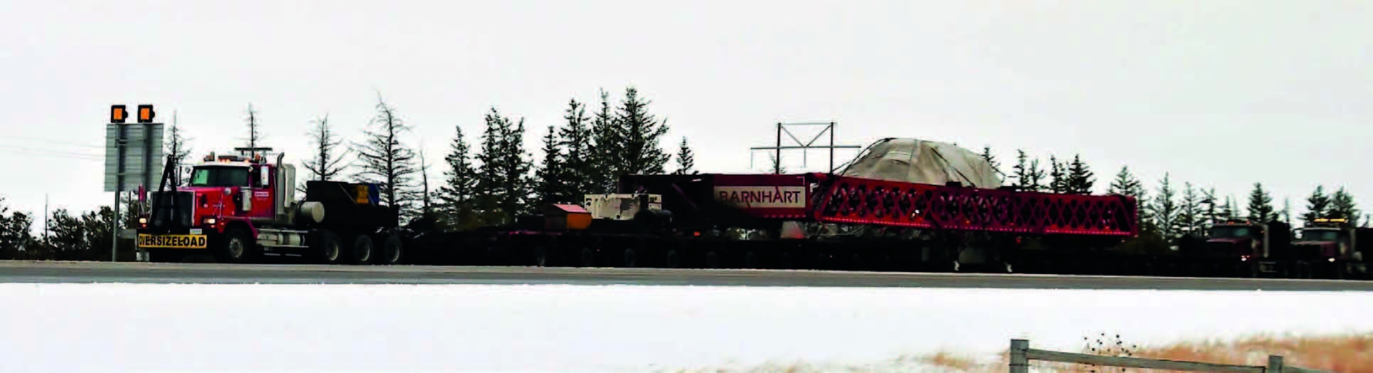 Barnhart was hired to transport a turbine and generator from Duluth, MN to Moose Jaw, Saskatchewan Canada, a journey of nearly 2,000 miles. The crew put together a convoy composed of prime movers, Eastrac trailers and a GS-800 Dreamliner.