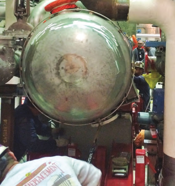 Every 1/16" mattered when it came to doing field measurements, so the customer also performed a laser scan of the space. After creating a very accurate model, the Barnhart team designed a system using pull up jacks and saddle rollers to remove the old exchangers.