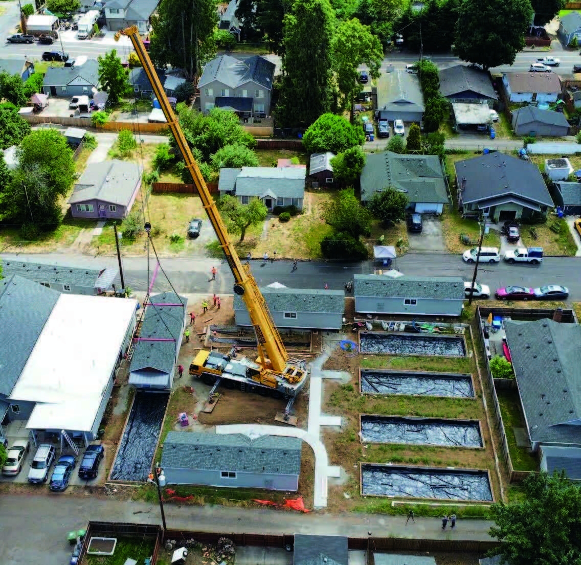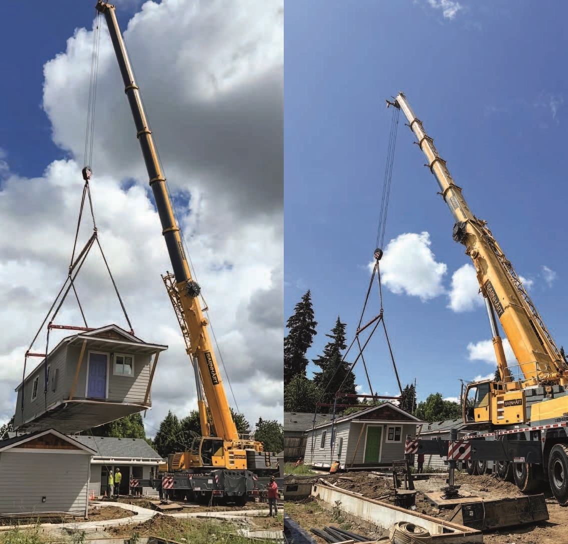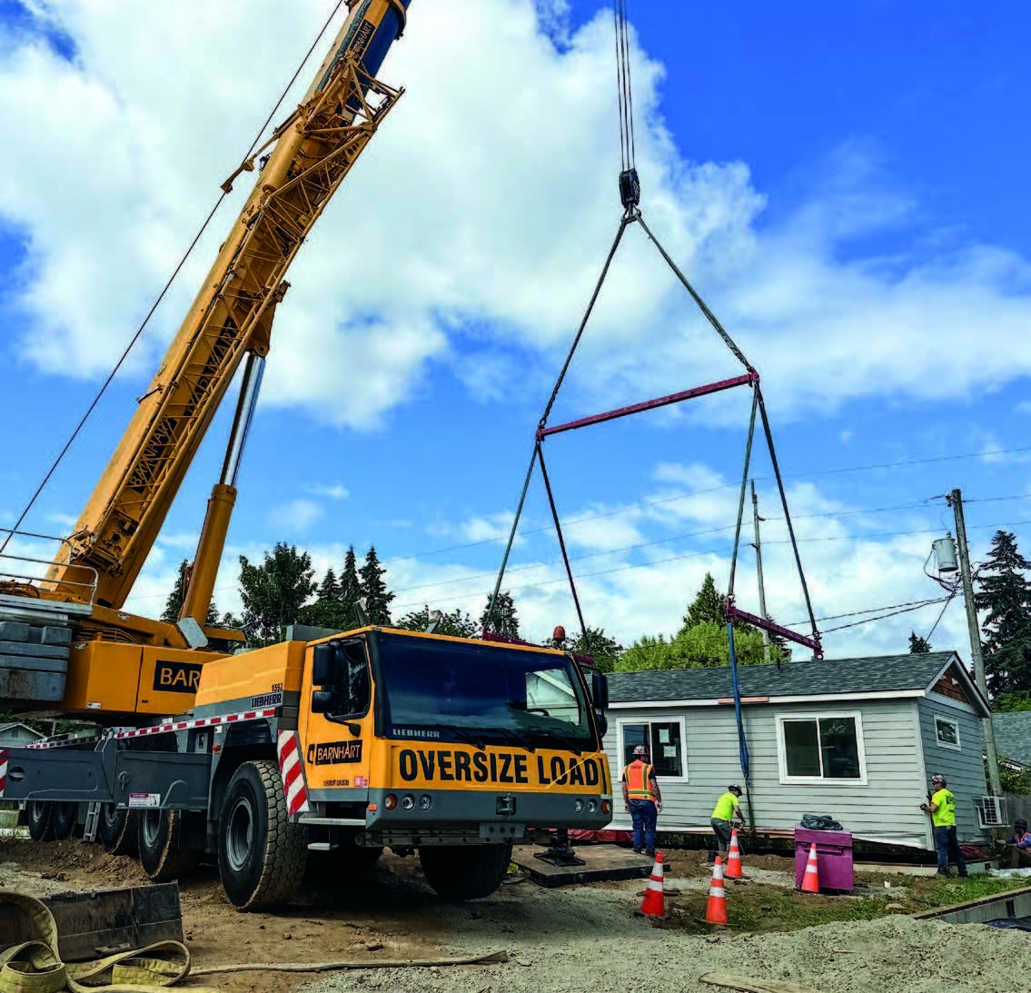 Barnhart’s Portland, Oregon branch was contracted to lift and set seven tiny prebuilt homes for a no-income housing community initiative in Vancouver, Washington. The site was challenging due to the tight space, which was barely big enough for the crane. Short notice was another challenging factor due to a crane competitor backing out of the project the day before the original lift date.