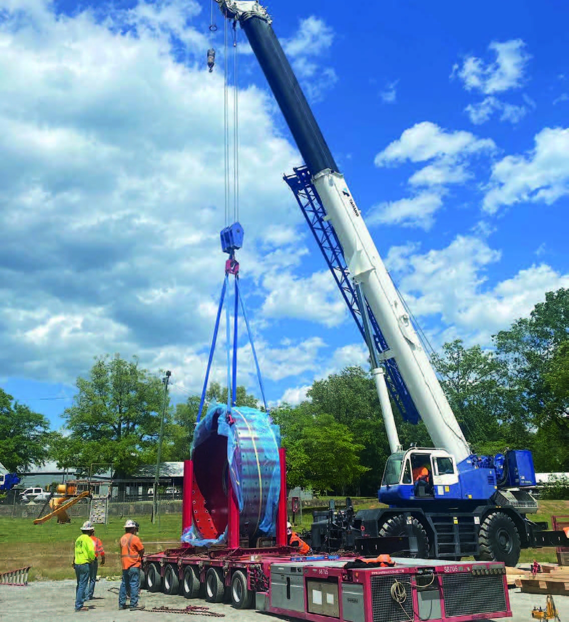 Barnhart was hired to receive and transport several turbine components to a powerhouse at a hydroelectric plant in Georgia. But first they had to invert the pieces to a vertical position using a 110' crane and a 40K Versalift to accommodate the width of the powerhouse door.