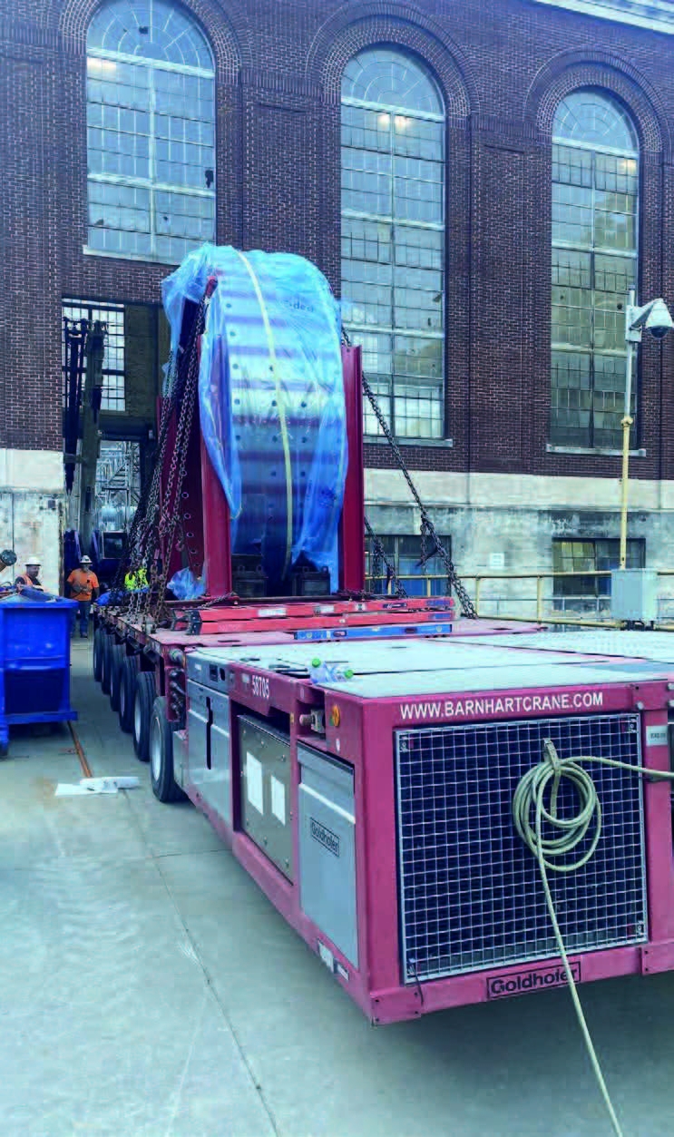 The components were transported 2.3 miles on a 6-Line PST Goldhofer trailer down a gravel road with a 12% grade to the powerhouse.