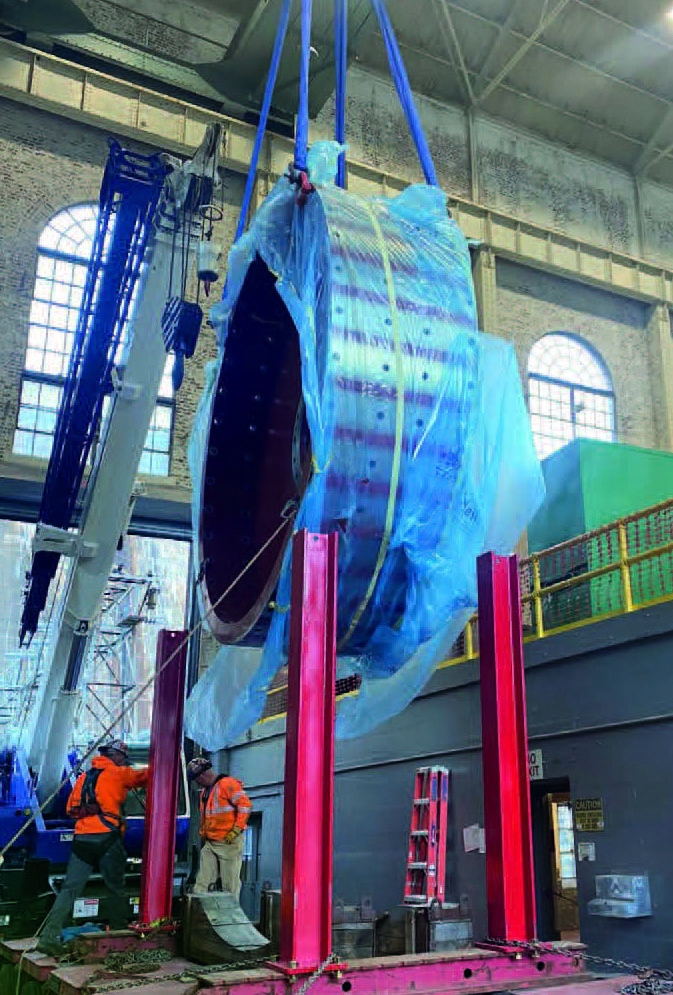 Once inside the powerhouse, the components were tailed back to a horizontal/assembly orientation using a rough terrain crane and the customer’s overhead crane.
