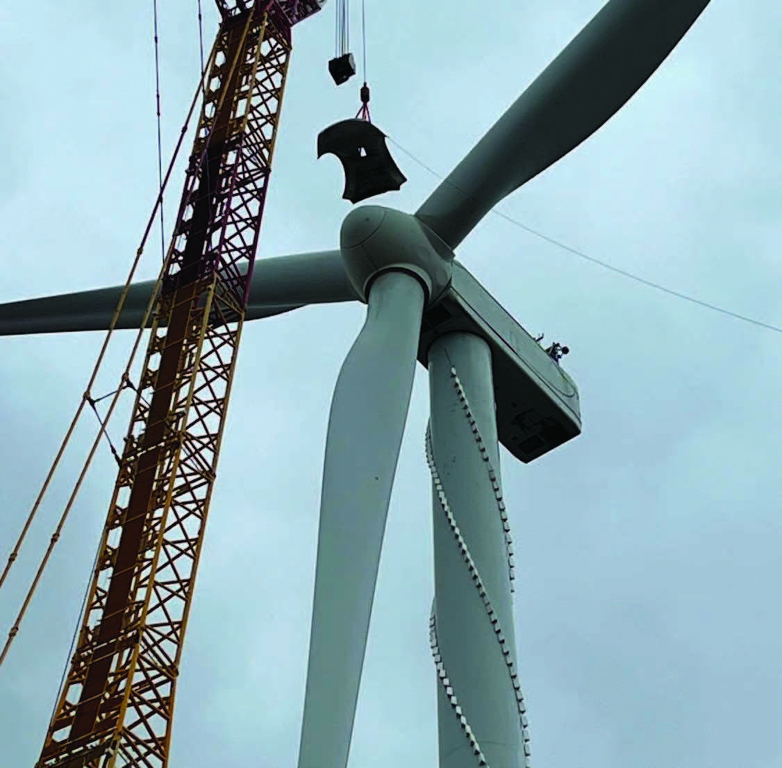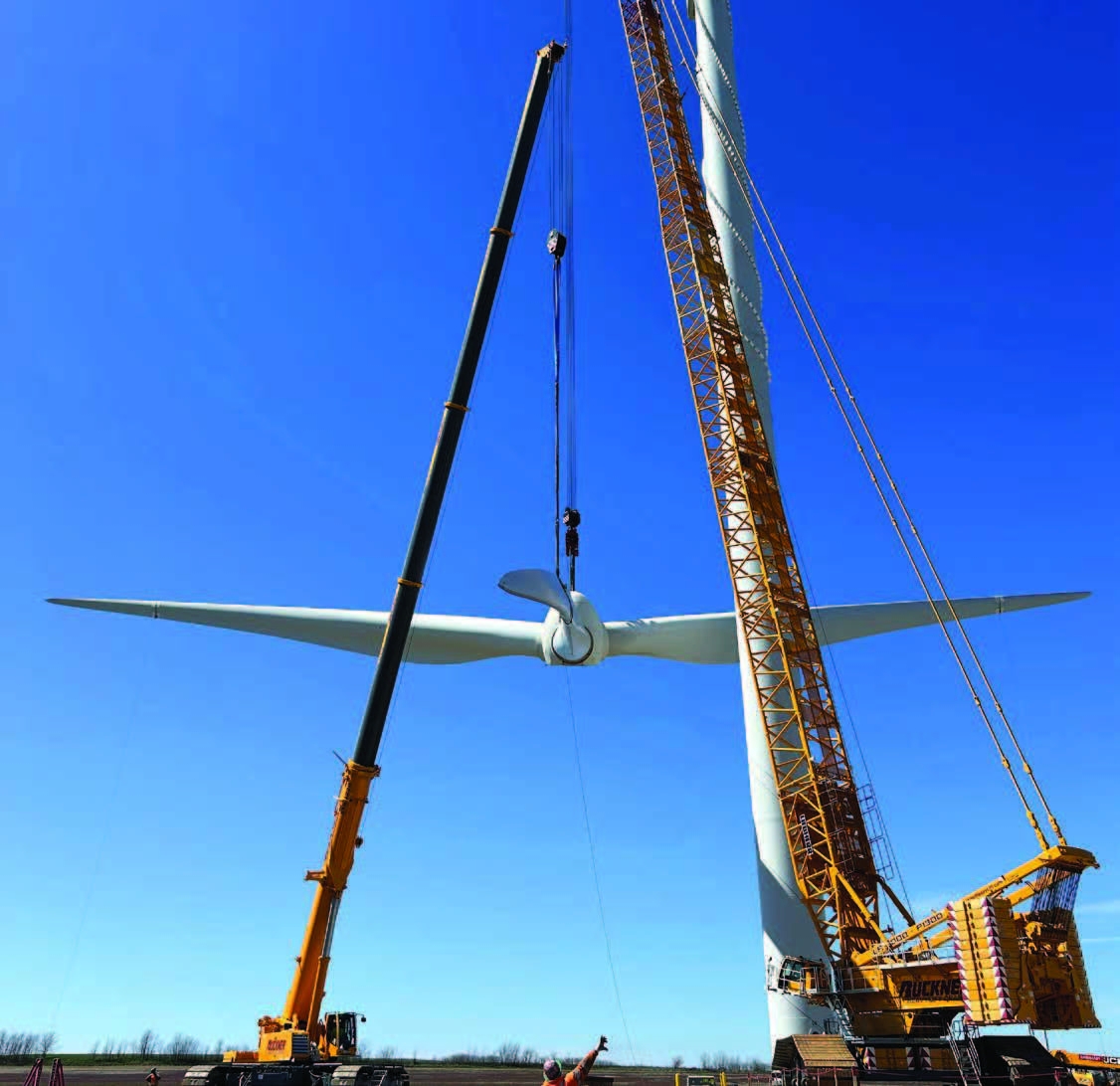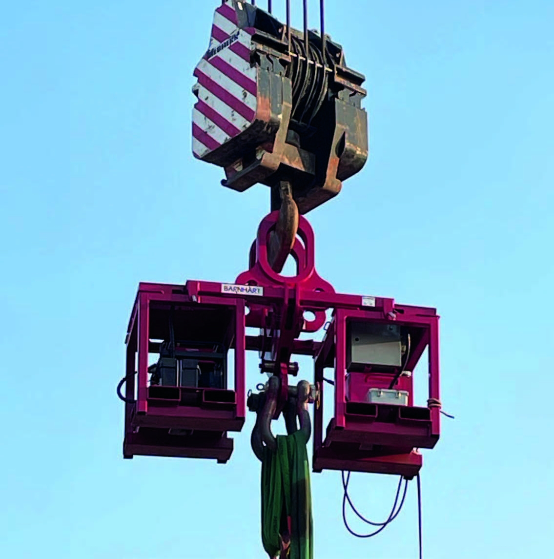 Barnhart’s fabricated lifting lugs, nicknamed “angel wings,” were attached to the hub and allowed for a single LR11000 crane to remove the rotor intact and downtail in coordination with a tail LTR 1220 crane. The team also designed a hanging power pack to provide electricity and hydraulics to the up-tower crews, saving them the need to run an umbilical 400 feet to the ground.