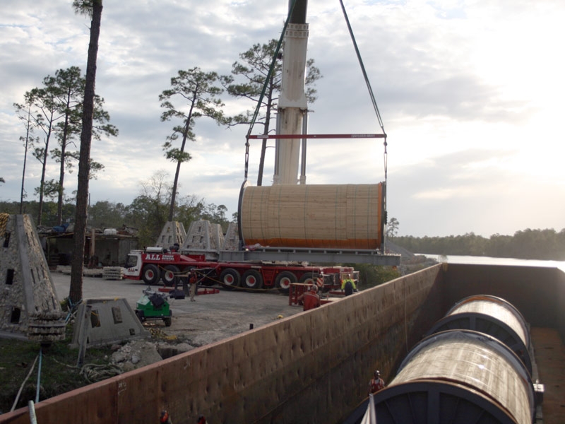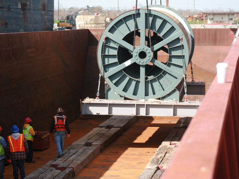 Barnhart provided inland transportation for four 140-ton power cable reels from the Port of Chalmette, LA by barge to an intermediate storage facility in Orange Beach, AL. The barge was placed alongside a vessel at the port where the team received the 30' long, 15' high, and 14'9" wide reels under the vessel's hook. They discharged the reels directly from the vessel to the barge and transported them to Orange Beach by way of the Port of Mobile, AL.