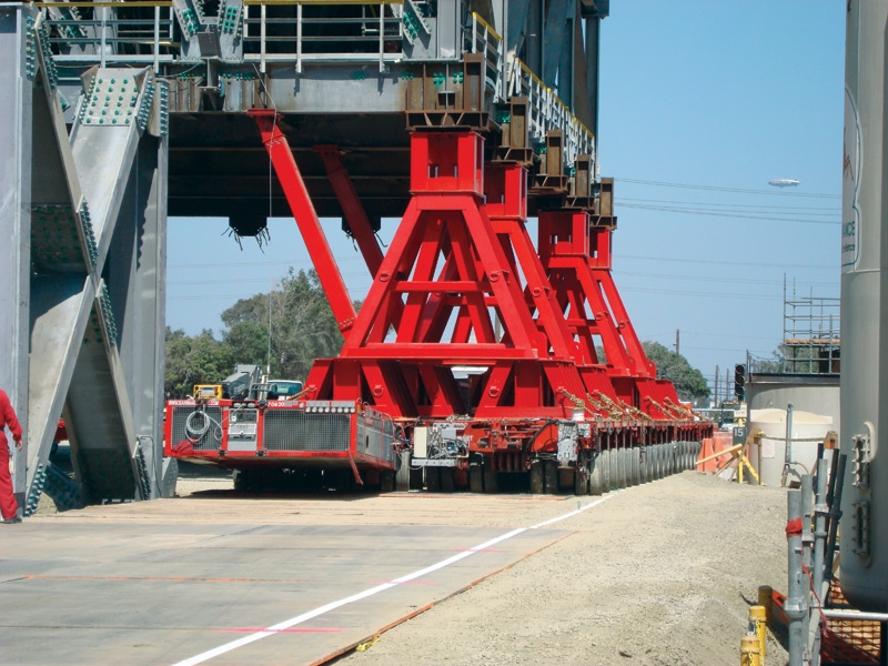The ESPs were constructed on top of Barnhart's shoring girders, approximately 1/4 mile away from their installation point. This prevented not only permitting issues but also interruptions within the plant for the customer. The first ESP was lifted to an elevation of 25 feet and then lowered a few inches to rest on stands connected to 88 lines of PSTe Goldhofer trailer. Once secure on the trailers, Barnhart hauled the first precipitator approximately 1/4 mile, while still almost 25 feet in the air.