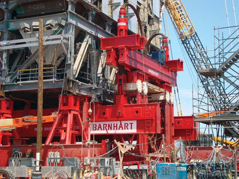 Solution: Barnhart assembled a custom configuration of its Modular Lift Tower with 650-ton strand jacks and 850-ton strand jacks to lift 1,100 ton and 1,500 ton units. PSTe Goldhofer units were used for haul.