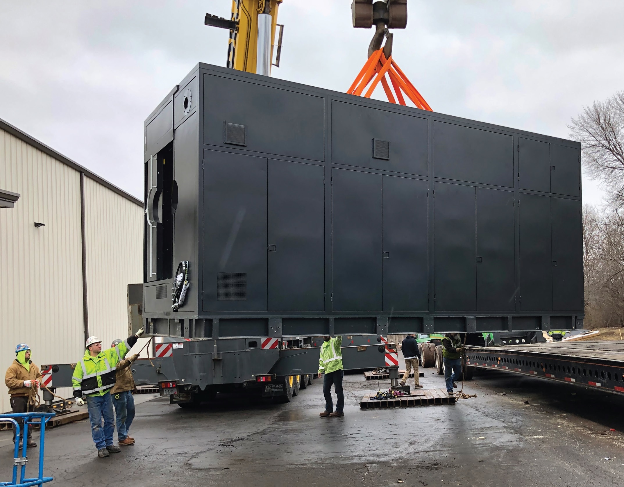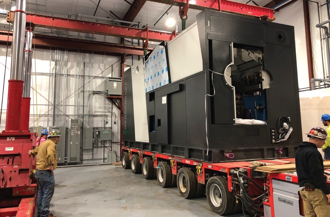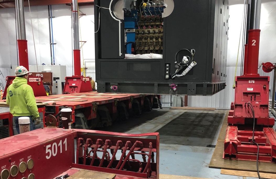 An industrial site in Wisconsin needed a 185,000-pound press set inside one of its buildings. The press had been hauled to the site and set on a trailer. After the press was offloaded from the trailer, Barnhart transported it inside using a Goldhofer PSTe.