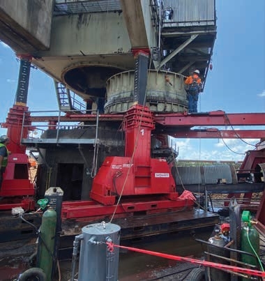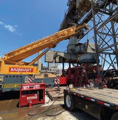 Once the bearing was slid out from underneath the reclaimer, the team rigged it to Barnhart’s 265-ton LTM 1220 crane.