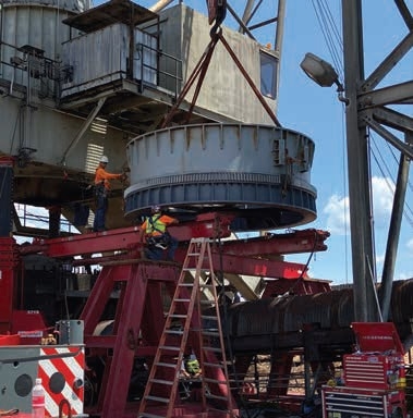 Once the old bearing was removed and the new one set in place, the reclaimer was lowered back on top of the rings and bearing. Despite muddy conditions, the job was performed safely. The crew will return to the site to perform the same job later this year.