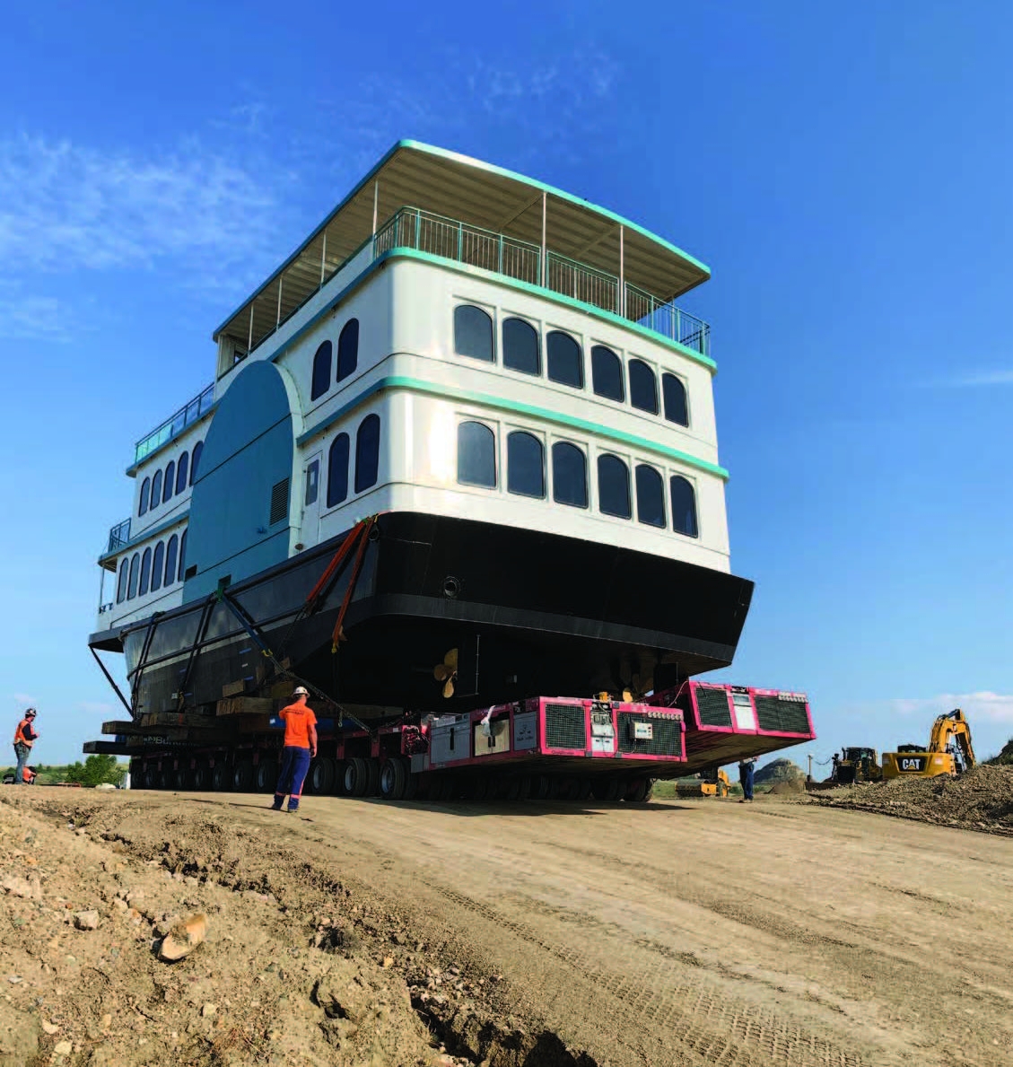 The boat was transported down a 16.8% grade several hundred yards on a PST double-wide 12-line Goldhofer to reach the launch site. The crane with counterweight was walked down the same incline to the second crane pad. This road was constructed using only native materials, which presented significant challenges including scheduling conflicts and soft areas difficult for the Goldhofer to navigate.