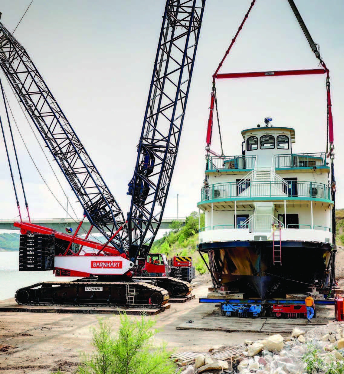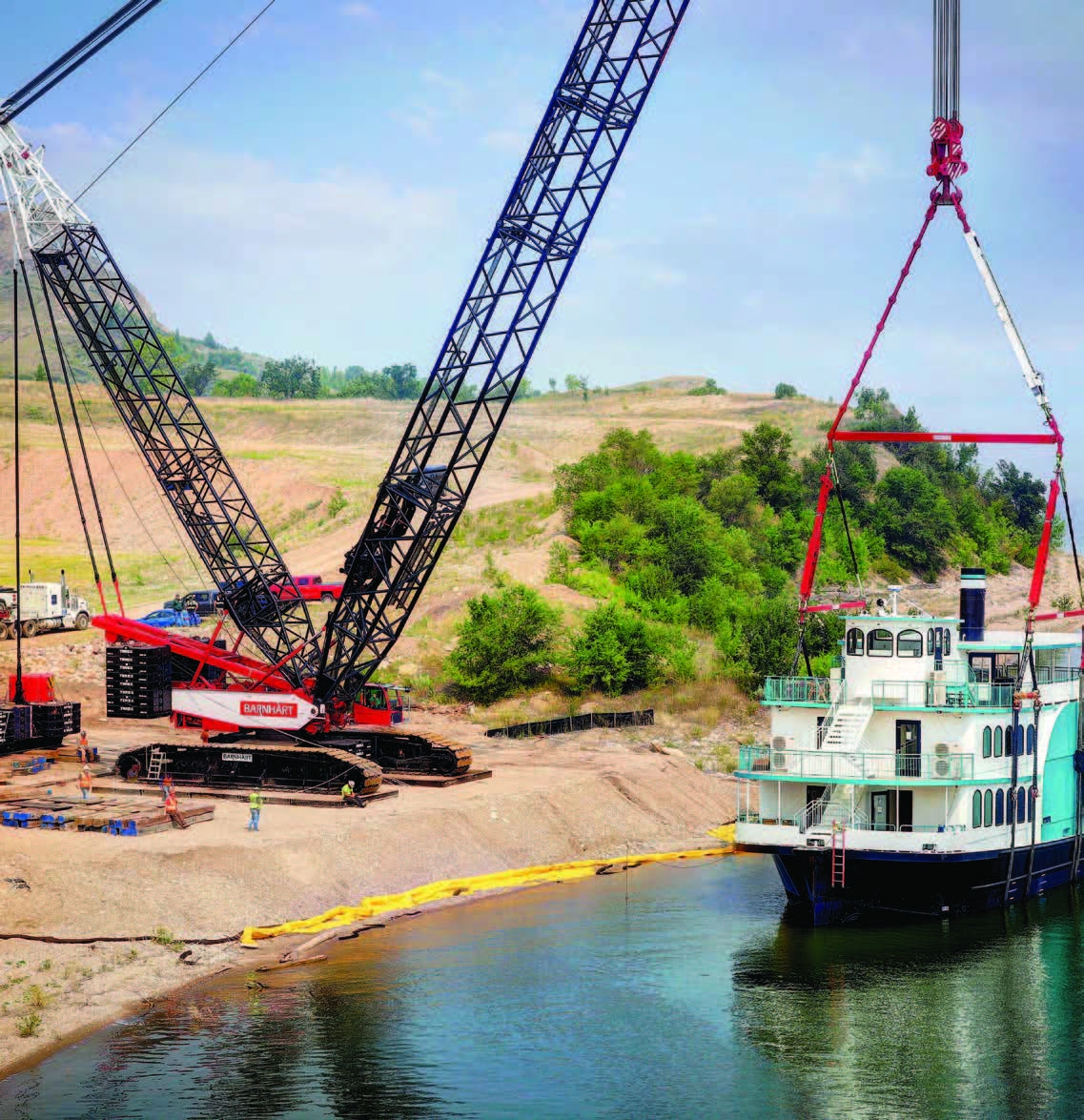 Barnhart used its CC 2800-1 SSL crane and 300-kip and 120-kip tension links to pick the boat from the Goldhofer and successfully set it in Lake Sakakawea. The project challenges included changing river elevations and river flow rate, heavy rain causing road and crane pad washouts and working over open water.