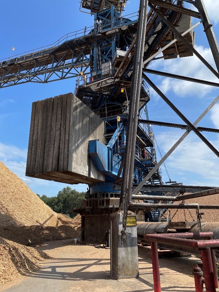 The hardwood stacker reclaimer weighed 670,000 pounds and the pine stacker reclaimer weighed 580,000 pounds, which made the PUGs even more valuable. Beyond high capacity, PUGs can block the units making it safe for crew to work underneath. They are also equipped with a holding valve for additional safety.
