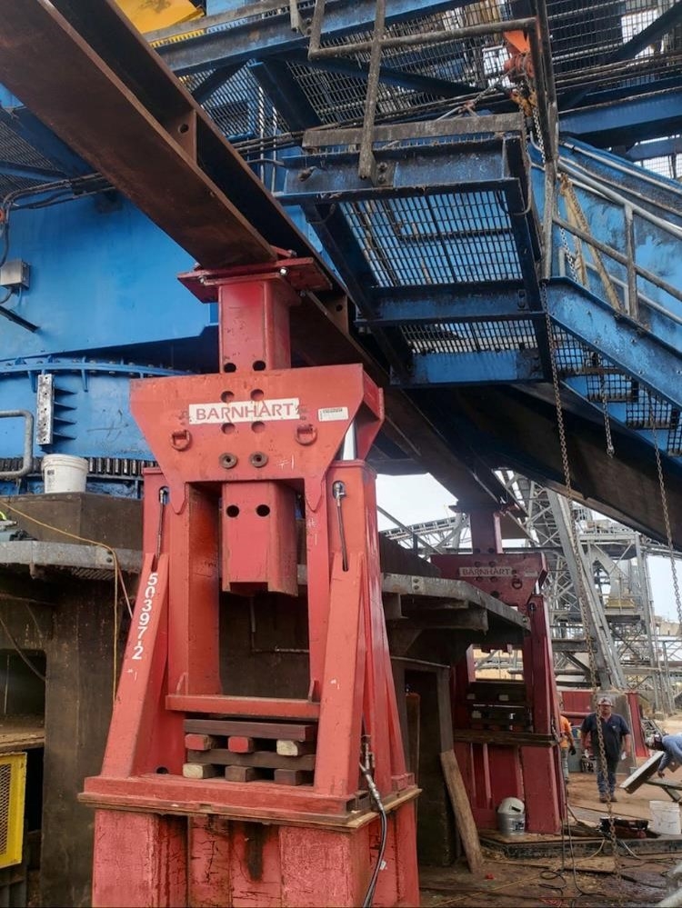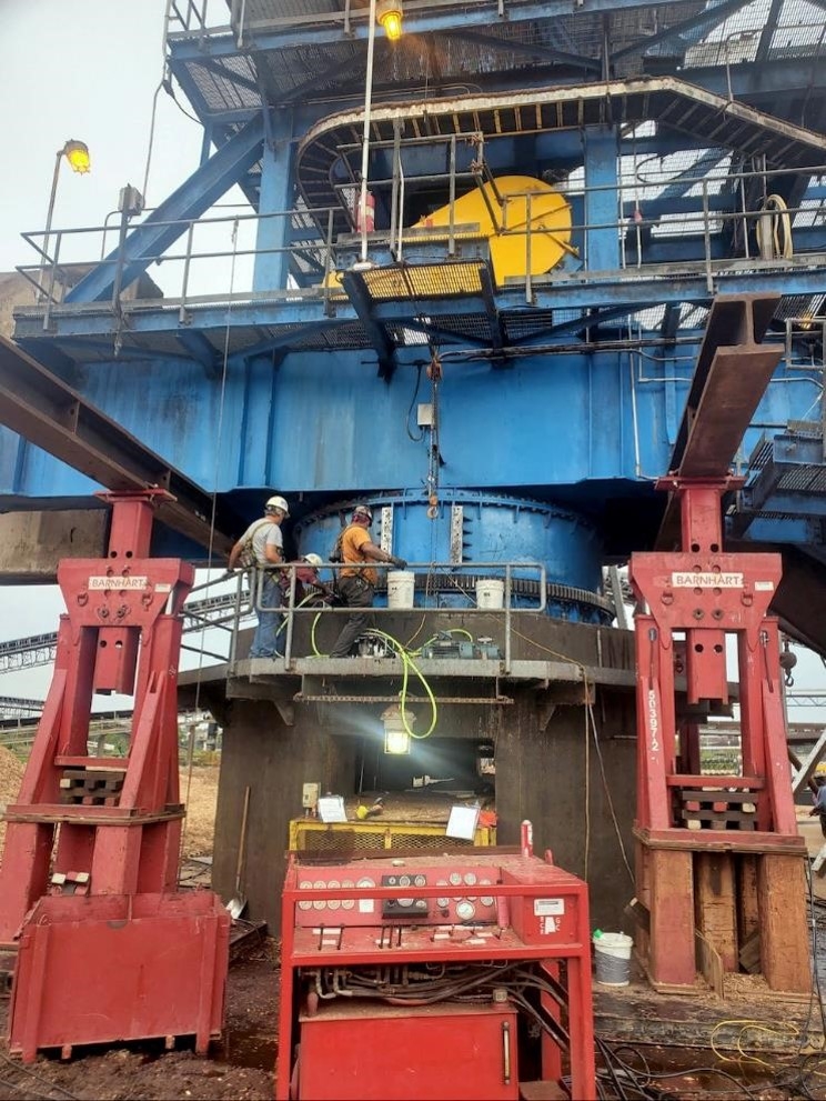 The crew set up and provided an operated pull-up gantry system (PUGs) to lift hardwood and pine stacker reclaimers 18” in order for the bearings to be replaced.