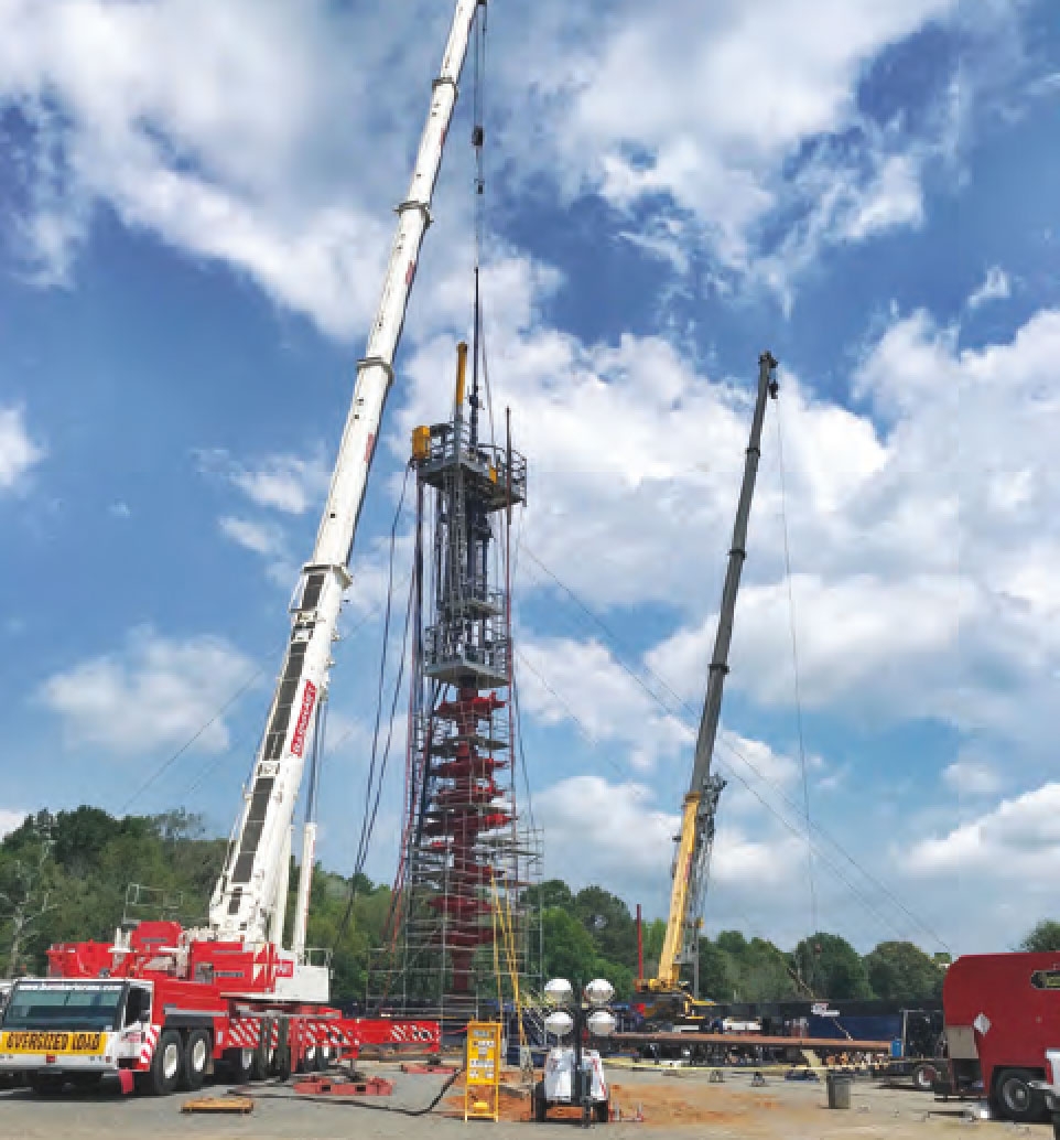 A Louisiana oil and gas production unit contracted with Barnhart to install a new snubbing unit with new piping and blowout preventers (BOPs). The team assembled a 90-ton crane, which was used to fly piping and smaller valves.