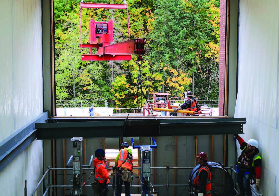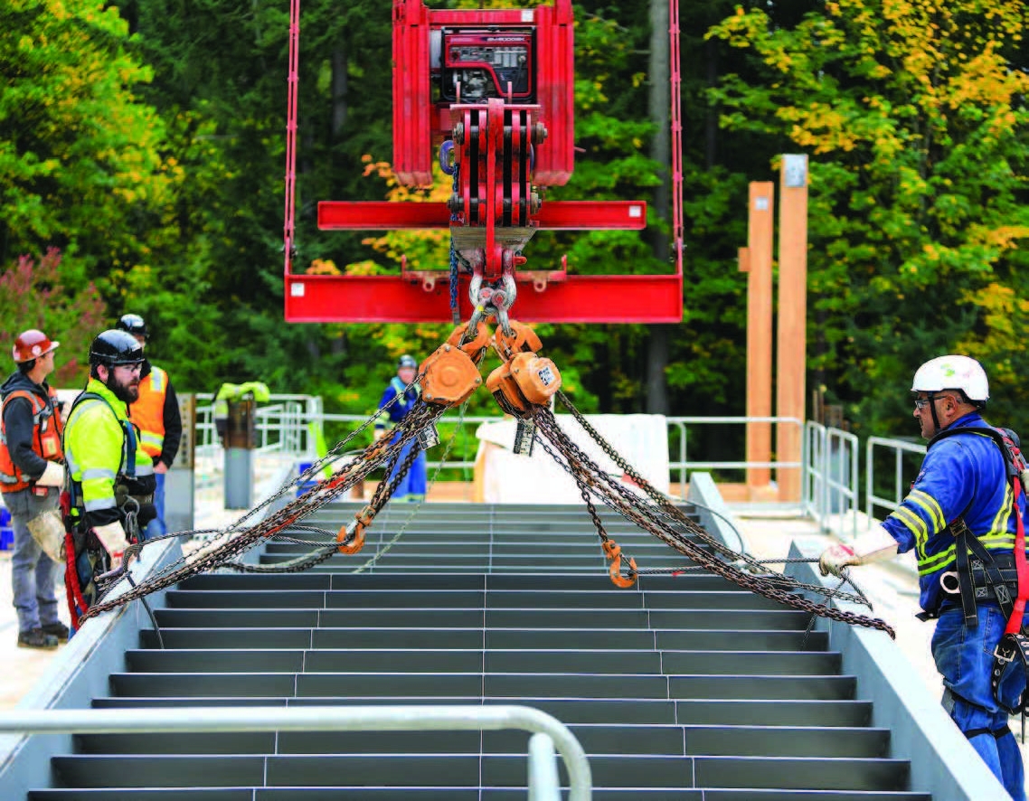 A custom staircase was assembled and rigged across from the access point. The MOCCs had to be configured in a single beam using three-ton chain falls that would be used to adjust the load once inside the building.