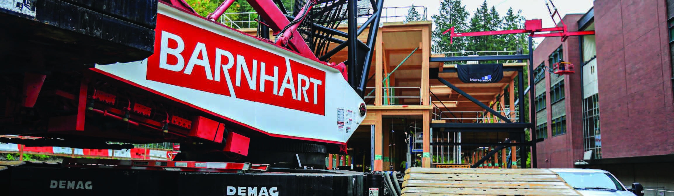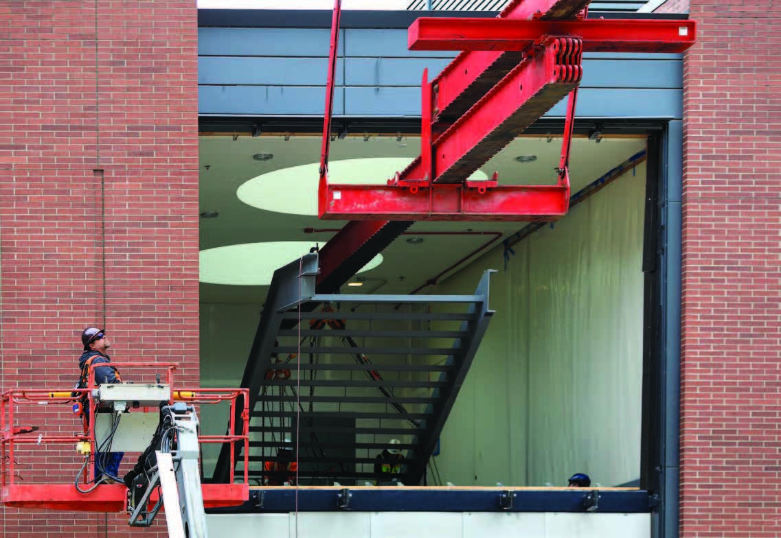 While on a project at a university with its CC2800, the Barnhart team was tasked with the challenge of retrofitting a stairway beneath an existing roof. The job required that the first and second levels of the stairwell remain intact. Barnhart proposed using its Movable Counterweight Cantilever System (MOCCs) due to limited access and clearance.