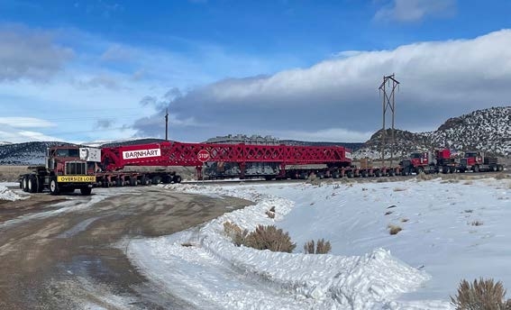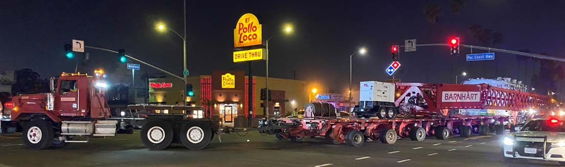 Barnhart was tasked with transporting a 485,500-pound transformer from the Pasha Terminal in Los Angeles to a substation outside of Ely, Nevada, a distance of over 500 miles. The transformer was 35’2” long, which required the use of Barnhart’s GS- 800 girder transport system. The team received the transformer from ship’s hook and secured the cargo.