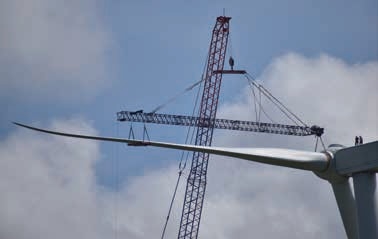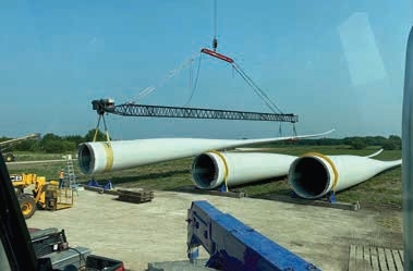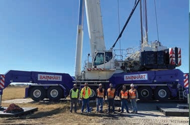 Barnhart used its Universal Blade Bar (UBB), which enabled the team to use a single 900-ton all-terrain crane. Using a single large but mobile crane is ideal when moving from turbine to turbine. The UBB also featured a remote-controlled Tip-Stick allowing the ground team to fine-tune center of gravity on the blades.