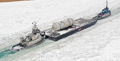 The biggest challenge in delivering cargo through the Great Lakes in winter is ice. Barnhart moved a 220,000 lb. knockout (KO) drum that was 72' long, 18'